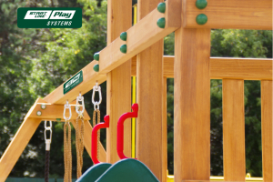 Башня высокая с лестницей, крыша из ткани, горка пластиковая -1,5 метра, лестница веревочная, кольца гимнастические, 8 ручек в форме камешков для скалодрома, вертикальный скалодром, встроенная песочница с местом для сиденья, рукоход, лестница гимнастическ